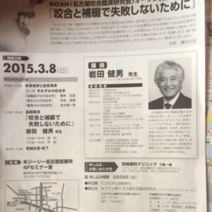 今日は朝から、咬合(かみあわせ)のスタディグループNoaa主催のオープン例会に参加しました。Noaaは若手の先生が多く、毎月、愛知学院大学の隣のGCという歯科メーカーの研修室で例会があり、診療後、可児からなるべく参加しています。講師の岩田健男先生は日本顎咬合学会の元理事長で、難解な咬合理論の話をわかりやすく解説していただきました。特に印象に残ったのは、予防の大切さと、長期的な予知性の高い治療の大切さを一番基本に考えるということでした。まだ経験の浅い歯科医師の私にとって、経験豊富でずっと最先端なことに取り組まれた、岩田先生の話はとても勉強になりました。一緒に参加した、セミナー仲間のごんちゃん(権田先生)と一枚(^^)