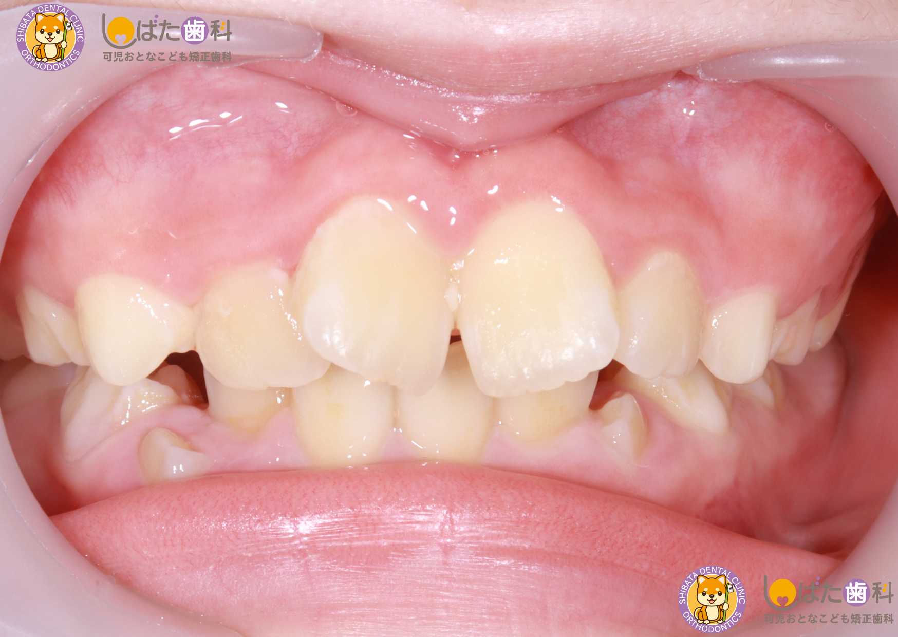 開咬とは、前歯が噛み合わず、上下に隙間ができてしまう状態です。指しゃぶりや舌癖が原因で生じることが多く、このまま放置すると永久歯に生え変わった後でも同じ問題が続く可能性があります。