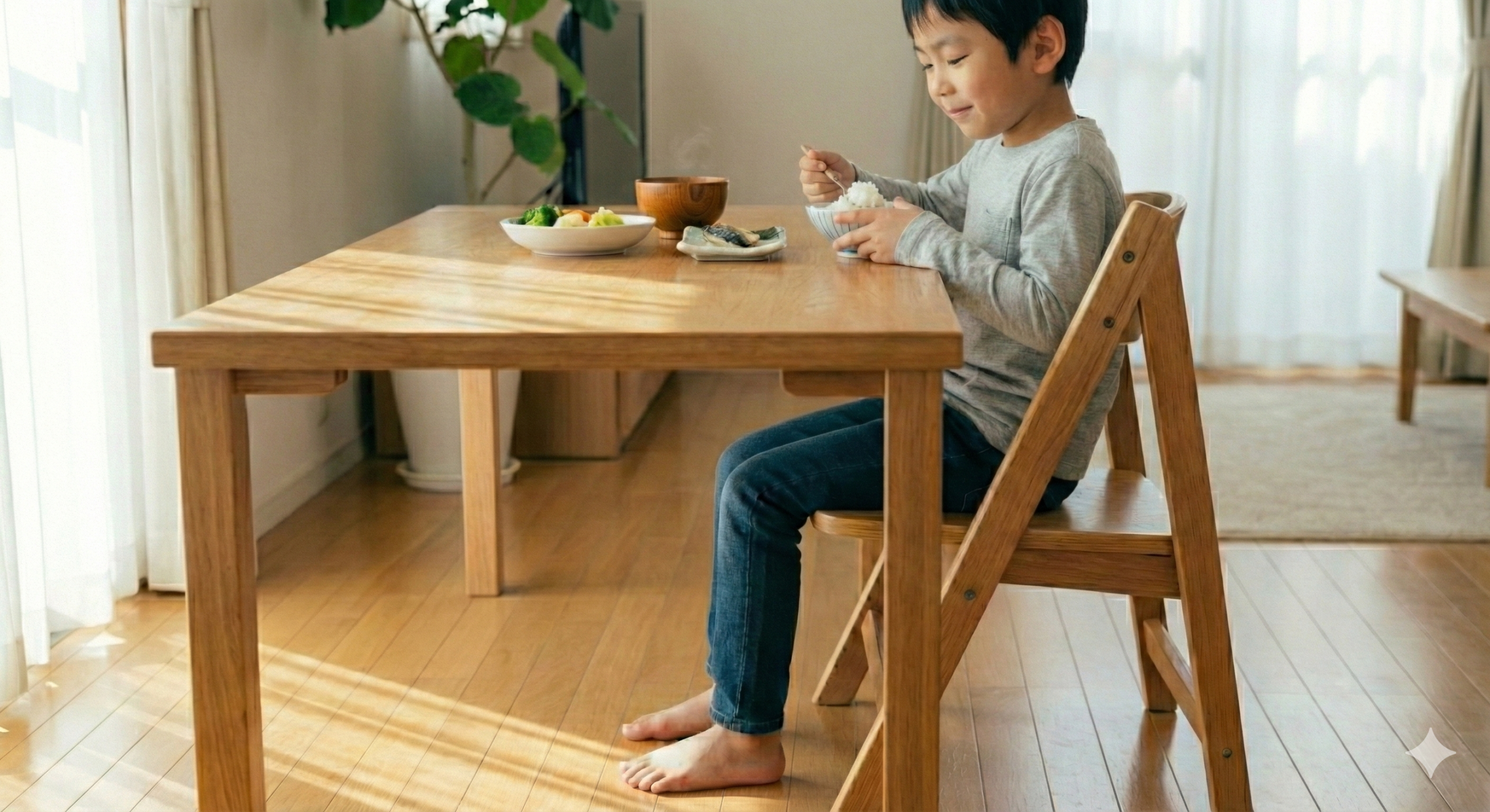 意外かもしれませんが、食事中の姿勢は歯並びに直結します。椅子が高すぎて足がぶらぶらしていると、踏ん張りがきかず、噛む力が半分以下にまで落ちてしまいます。足置き場などを使って、足の裏をしっかり地面につけるだけで、顎にかかる力は劇的に変わります。