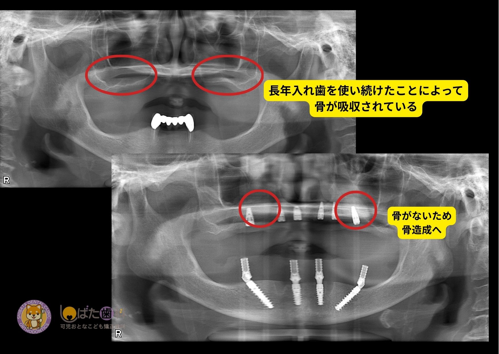 入れ歯を使って、10年経つ頃には、骨が大きく減っている方も多く、「入れ歯が動く・外れる」と言われる方も多いです。