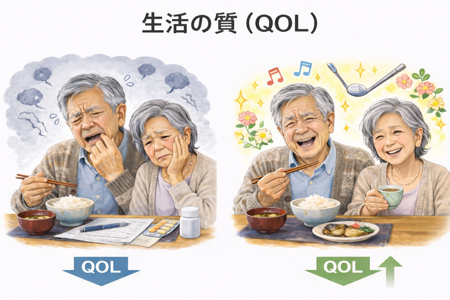 噛めない状態が続くと飲み込みの機能(嚥下)が弱まり、誤嚥性肺炎・栄養不足・フレイルのリスクも高まります。