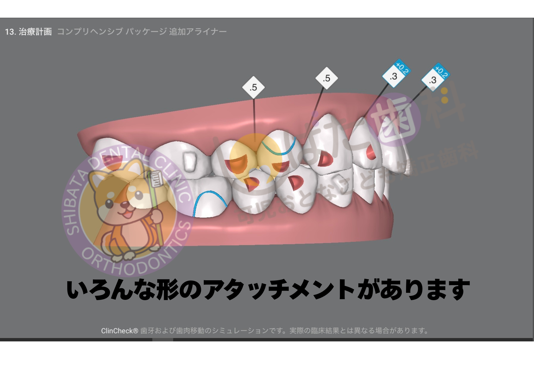 そこで、歯と同じ色のレジン(歯科用プラスチック)で「アタッチメント」を付けます。