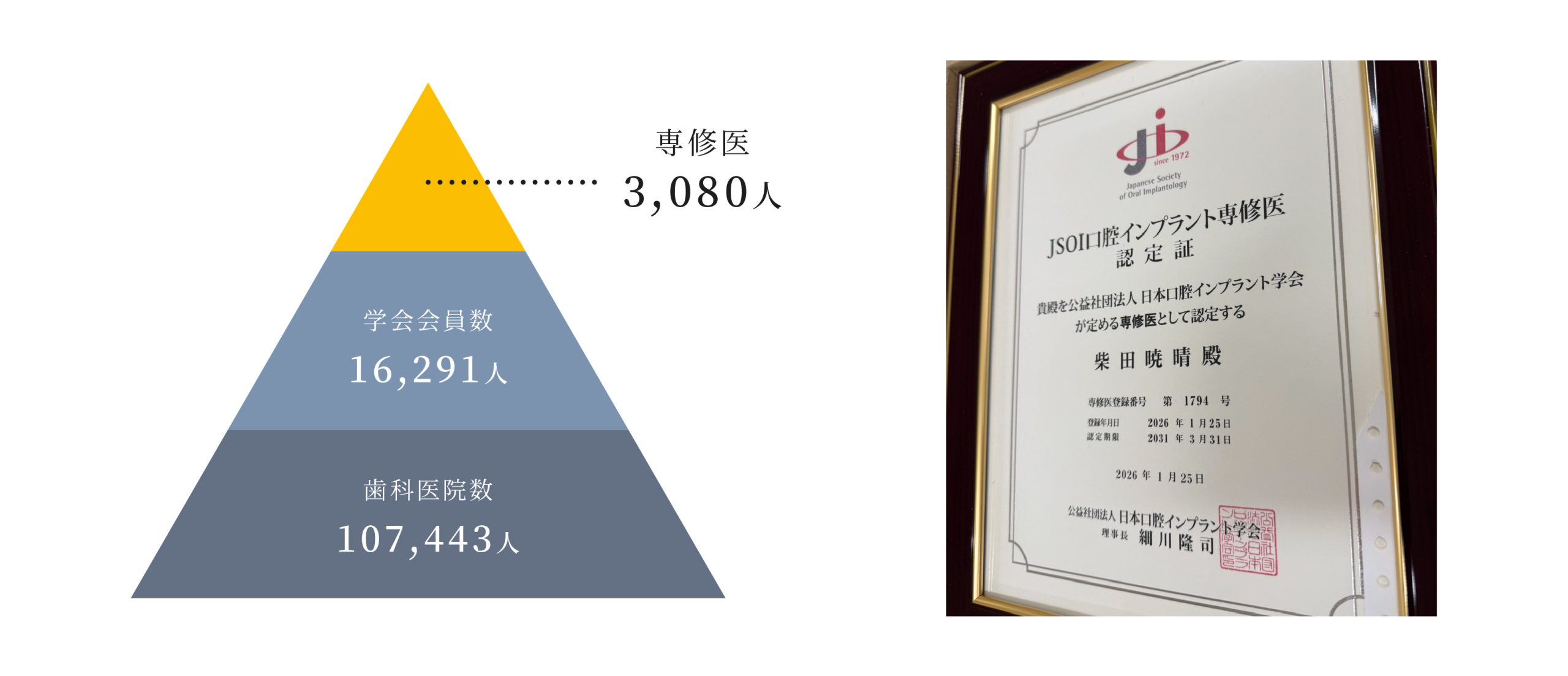 全国に約3,080名の取得者がおり、日進月歩のインプラント治療において、学会の指針に基づいた適切な診査・診断、そして安全な手術を実践できる歯科医師にのみ与えられる称号です。